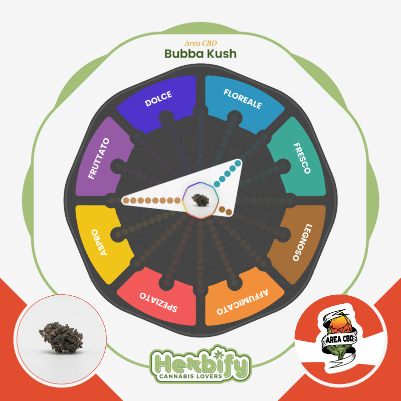 La Bubba Kush è una varietà intensa e corposa, con un aroma agrumato e terroso in cui le note di limone si intrecciano a sentori di caffè, spezie e legno. La coltivazione greenhouse le permette di sviluppare cime dense e molto resinose, di colore verde scuro con riflessi bronzei e uno strato generoso di tricomi che ne esalta il carattere deciso. Il profilo terpenico è profondo, caldo e strutturato, ma bilanciato dalla freschezza degli agrumi.
